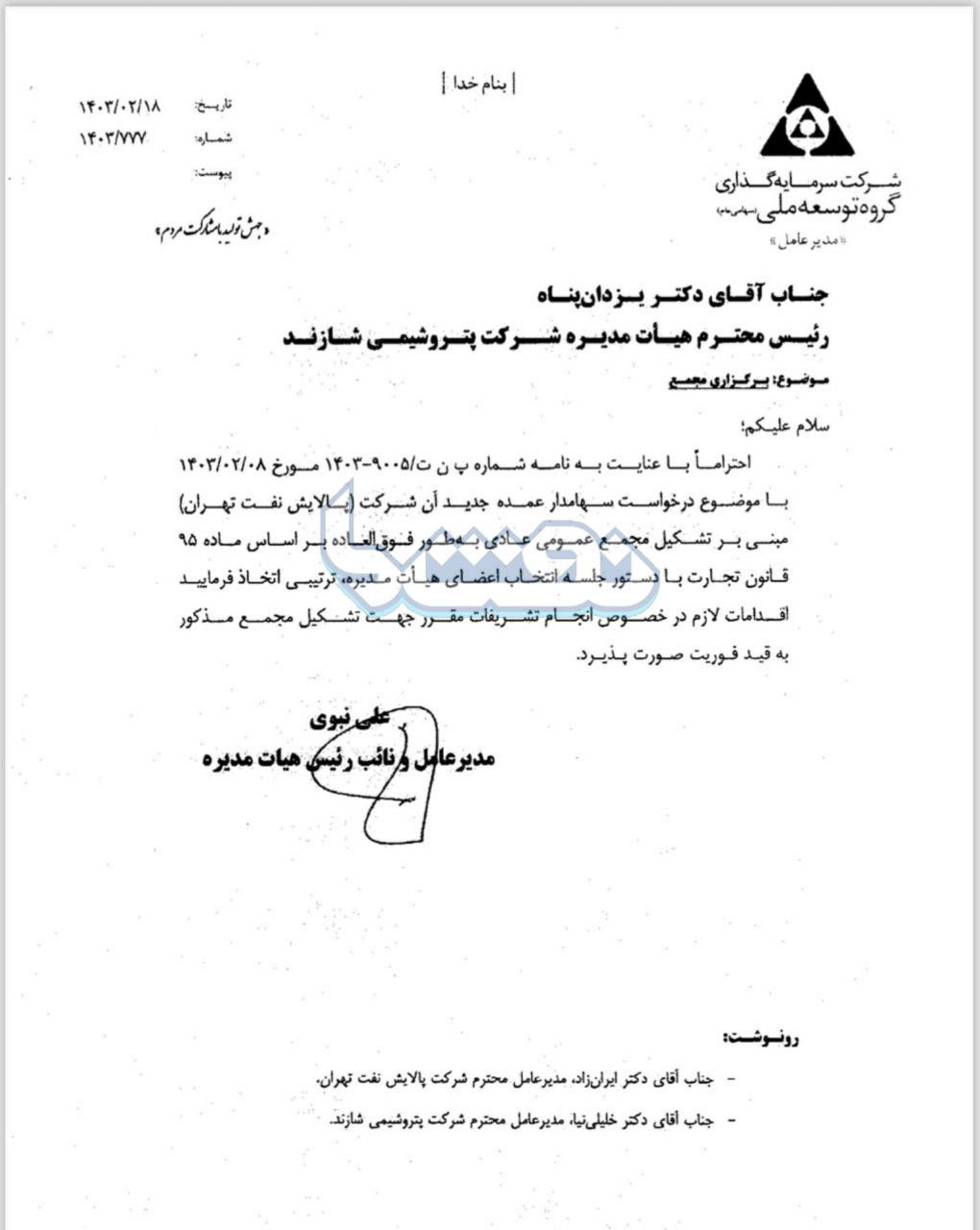 نامه گروه توسعه ملی به پتروشیمی شازند برای سرعت در تشکیل مجمع/ پالایشگاه تهران آگهی مجمع منتشر کرد