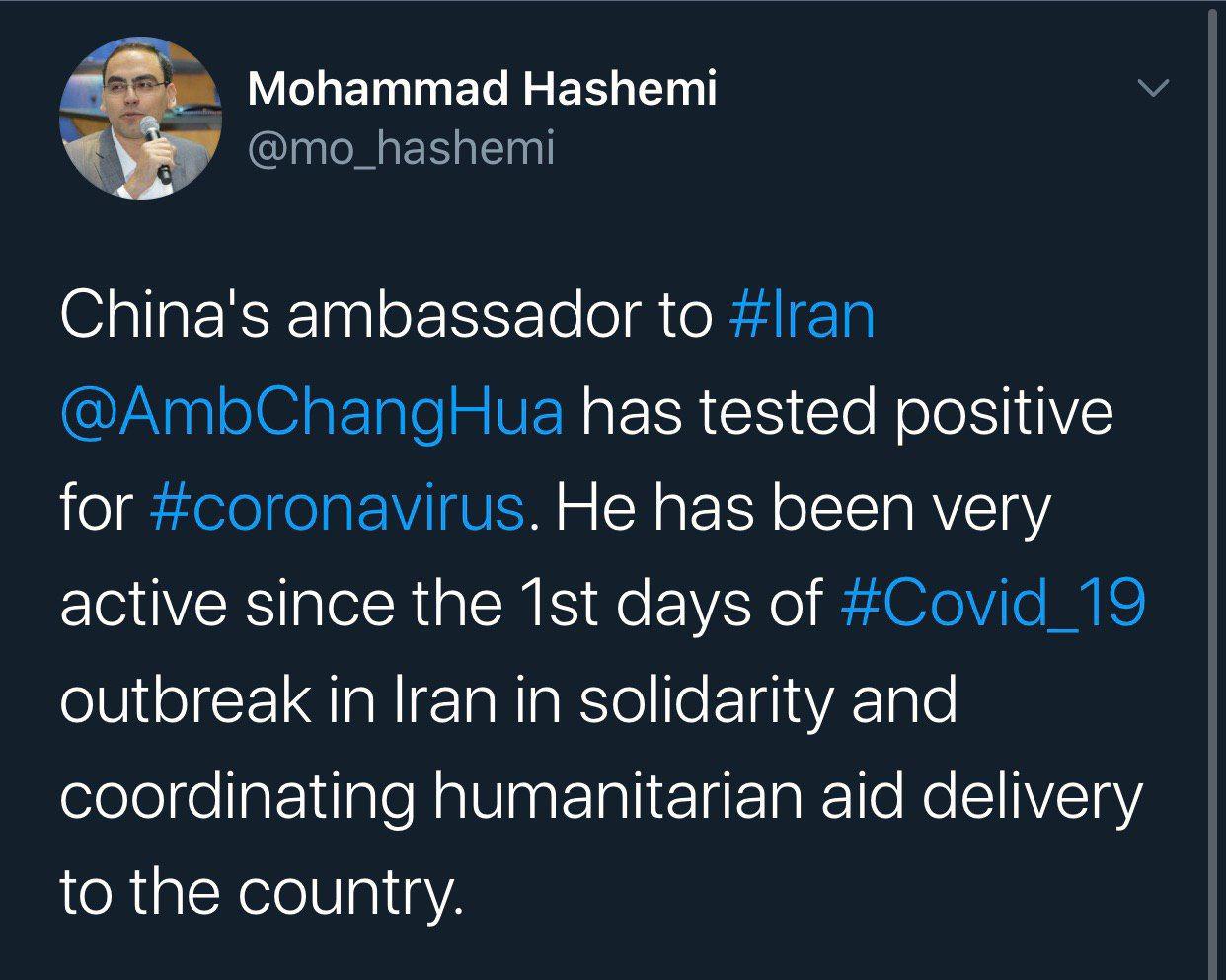 خبرنگار پرس تی وی مدعی شد: سفیر چین در ایران به کرونا مبتلا شده است.