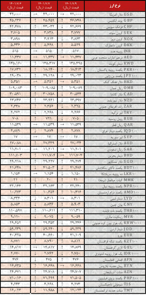 بانک مرکزی امروز، شنبه (۹ مهر)، نرخ رسمی ۴۶ ارز را اعلام کرد که بر اساس آن نرخ ۲۱ ارز افزایش و نرخ ۱۶ ارز کاهش یافت. نرخ باقی ارزها ثابت ماند.