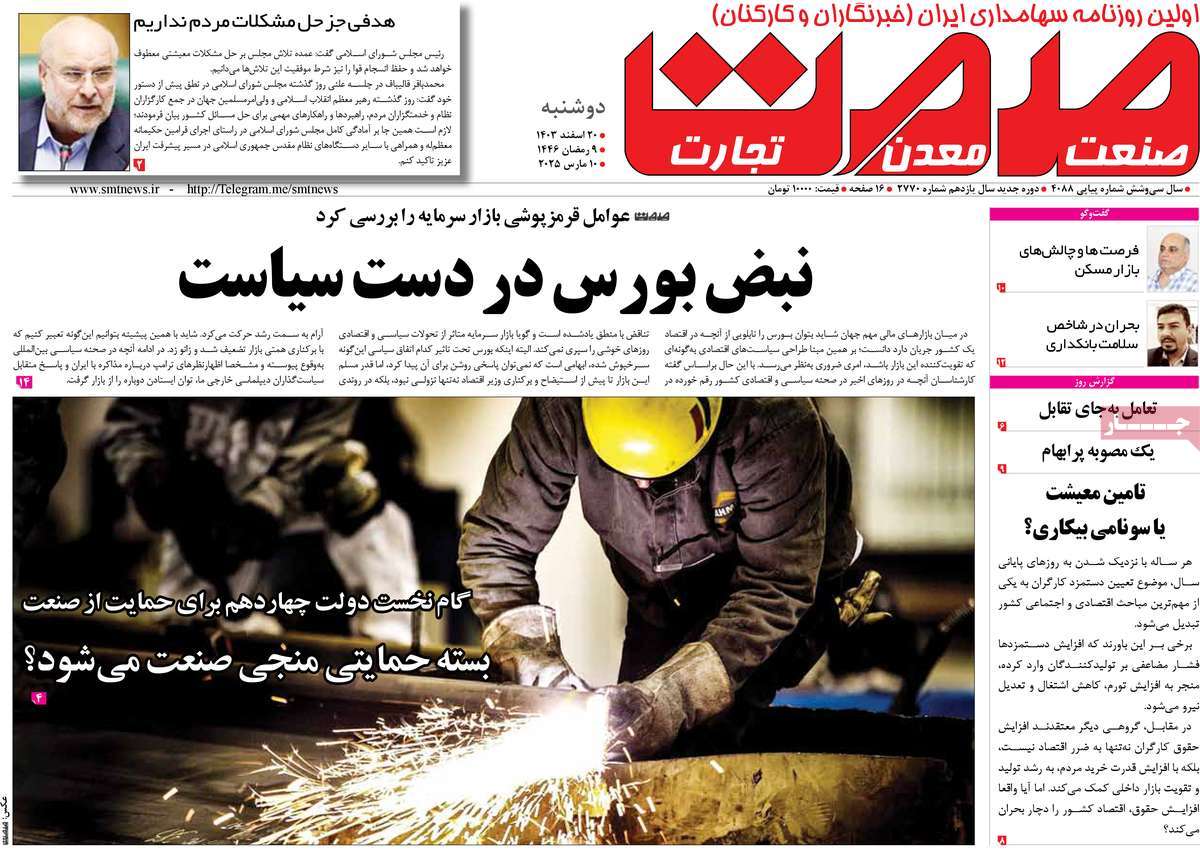 تصاویر صفحه اول روزنامه های امروز دوشنبه 20 اسفند ماه .