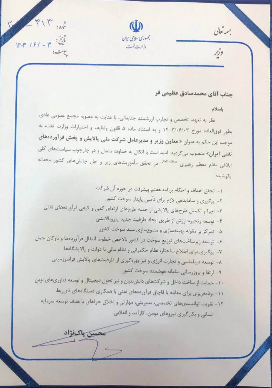 عظیمی فر مدیرعامل شرکت ملی پالایش و پخش شد