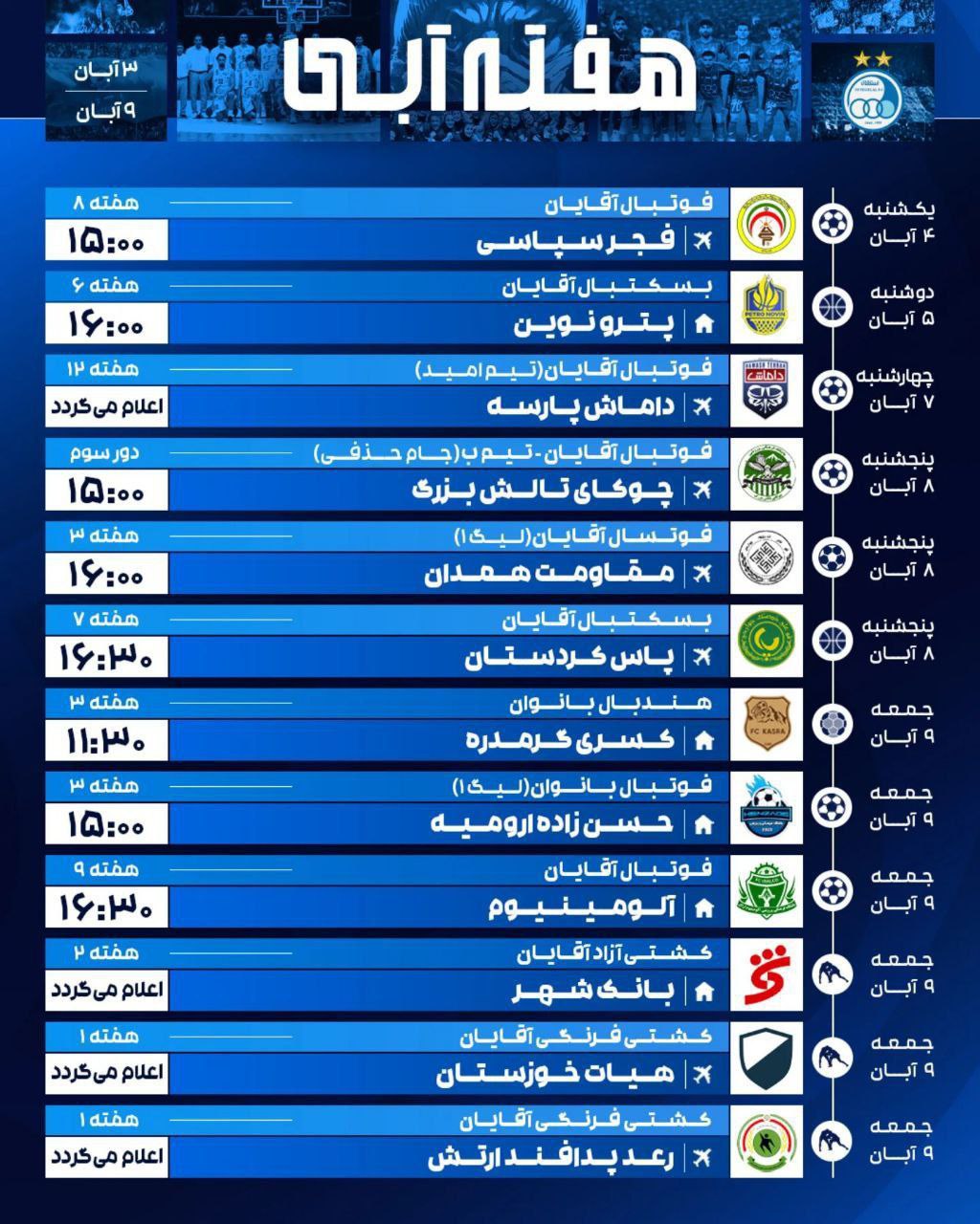 این جدول، مسابقات تیمهای ورزشی استقلال را در این هفته نشان می‌دهد. در نیمی از این رشته‌ها، از جمله کشتی آزاد و فرنگی، بسکتبال، هندبال و...تیم استقلال در همین ماههای اخیر تشکیل شده و خبر آخر آنکه تیم چوگان استقلال هم تشکیل شده!